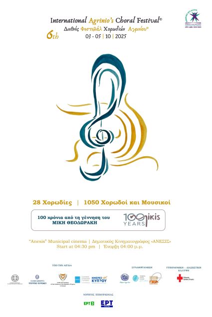 Αύριο Παρασκευή 3 Οκτωβρίου ξεκινά στην πόλη του Αγρινίου το 6ο Διεθνές Φεστιβάλ Χορωδιών, πολυσυλλεκτική διοργάνωση που αποσκοπεί στην παρουσίαση υψηλού επιπέδου χορωδιακής μουσικής. Στο φεστιβάλ θα συμμετάσχουν 28 χορωδίες από την Ελλάδα, την Κύπρο και άλλες ευρωπαϊκές χώρες, με κορυφαίους μαέστρους και 1.050 χορωδούς. Επίτιμη καλεσμένη χορωδία και στο φετινό φεστιβάλ θα είναι η ανδρική «The Gwalia Singers», από τις καλύτερες χορωδίες της Ουαλίας, ενώ με αφορμή τη συμπλήρωση μισού αιώνα από την εισβολή στην Αμμόχωστο και στο πλαίσιο των Ημερών Κύπρου 2025, θα βραβευτεί η Χορωδία του Δήμου Αμμοχώστου. Το φεστιβάλ θα ολοκληρωθεί την προσεχή Κυριακή 5 Οκτωβρίου.