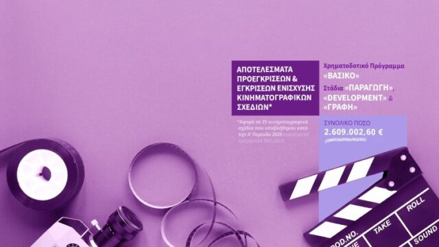 Το Ε.Κ.Κ.Ο.ΜΕ.Δ. ανακοίνωσε τη Δευτέρα 13 Οκτωβρίου, τη χορήγηση προεγκρίσεων και εγκρίσεων χρηματοδότησης συνολικού ύψους 2.609.002,60 ευρώ για είκοσι πέντε (25) κινηματογραφικά σχέδια που υποβλήθηκαν στα στάδια ΠΑΡΑΓΩΓΗ, DEVELOPMENT και ΓΡΑΦΗ στο πλαίσιο του προγράμματος ΒΑΣΙΚΟ κατά την περίοδο 2025Α (καταληκτική ημερομηνία υποβολής 30.06.2025).