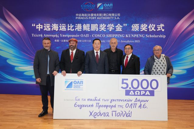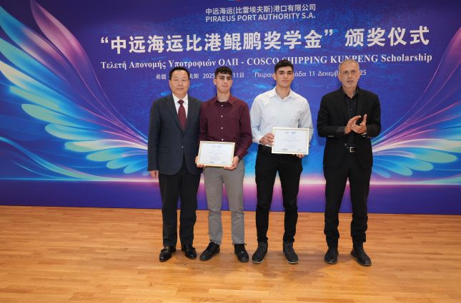 Με ιδιαίτερη επιτυχία και παρουσία εκπροσώπων της Πολιτείας, της Τοπικής Αυτοδιοίκησης και της Πρεσβείας της Λαϊκής Δημοκρατίας της Κίνας, πραγματοποιήθηκε σήμερα στις εγκαταστάσεις του Οργανισμού Λιμένος Πειραιώς η πρώτη τελετή απονομής των υποτροφιών “Kunpeng Scholarship” (PPA–COSCO SHIPPING Kunpeng Scholarship).