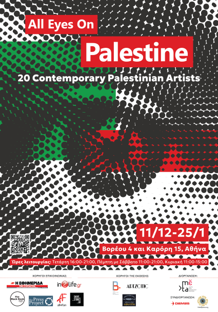 Η έκθεση-ορόσημο της σύγχρονης παλαιστινιακής τέχνης, All Eyes on Palestine ανοίγει τις πόρτες της την Πέμπτη 11 Δεκεμβρίου 2025 στην καρδιά του ιστορικού κέντρου της Αθήνας (Καρόρη 15 & Βορέου 4). Η έκθεση τιμά 20 Παλαιστίνιους καλλιτέχνες που γεννήθηκαν μεταξύ των δύο Ιντιφάντα και τώρα εργάζονται στη Γάζα, τη Δυτική Όχθη, τη Γαλλία, το Ηνωμένο Βασίλειο και αλλού.