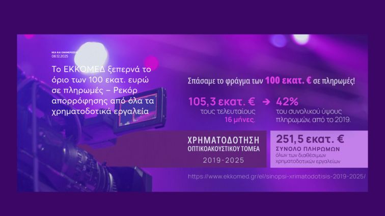 Το ΕΚΚΟΜΕΔ πέτυχε ένα σημαντικό ορόσημο, ξεπερνώντας για πρώτη φορά τα 100 εκατ. ευρώ σε πληρωμές προς την οπτικοακουστική παραγωγή, μέσα σε διάστημα μόλις 16 μηνών λειτουργίας.