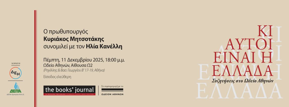 Την Πέμπτη, 11/12, στις 6 το απόγευμα, ο πρωθυπουργός της Ελλάδος Κυριάκος Μητσοτάκης είναι ο προσκεκλημένος του Ηλία Κανέλλη στο Ωδείο Αθηνών. Είναι η τρίτη εκδήλωση του πρώτου κύκλου δημόσιων συζητήσεων «Κι αυτοί είναι η Ελλάδα – Συζητήσεις στο Ωδείο Αθηνών» που συνδιοργανώνουν το Περιοδικό των Βιβλίων, The Books’ Journal, και το Ωδείο Αθηνών, στους χώρους του Ωδείου.