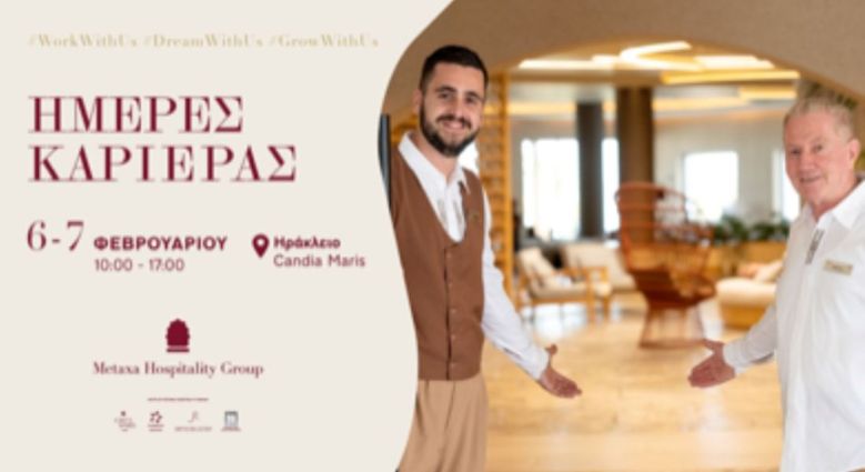 Το Metaxa Hospitality Group, αναγνωρισμένος ως «Κορυφαίος Όμιλος Φιλοξενίας στην Ελλάδα 2021-2025» από τα World Travel Awards, διοργανώνει και φέτος τις «Ημέρες Καριέρας» στις 6 και 7 Φεβρουαρίου στο Ηράκλειο Κρήτης, προσφέροντας σημαντικές ευκαιρίες απασχόλησης στα ξενοδοχεία του στην Κρήτη και τη Σαντορίνη.