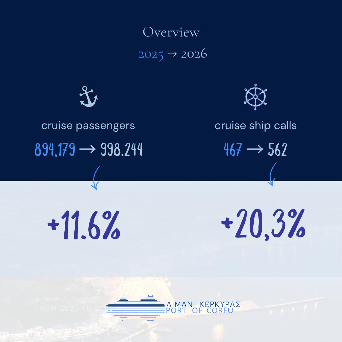 Για το 2026 έχουν προγραμματιστεί συνολικά 562 προσεγγίσεις κρουαζιερόπλοιων, αριθμός που αποτυπώνει αύξηση της τάξης του 20,3% σε σχέση με τον προηγούμενο χρόνο και ενισχύει περαιτέρω τη θέση της Κέρκυρας στο διεθνές δίκτυο της κρουαζιέρας. Με βάση τον υφιστάμενο προγραμματισμό, αναμένεται η επίσκεψη 998.244 επιβατών, με τα διαθέσιμα στοιχεία να καταδεικνύουν τάση υπέρβασης του ορίου αυτού, καθώς η ζήτηση για την Κέρκυρα ενισχύεται τόσο στην υψηλή όσο και στη λεγόμενη «ώριμη» και εκτός αιχμής περίοδο.