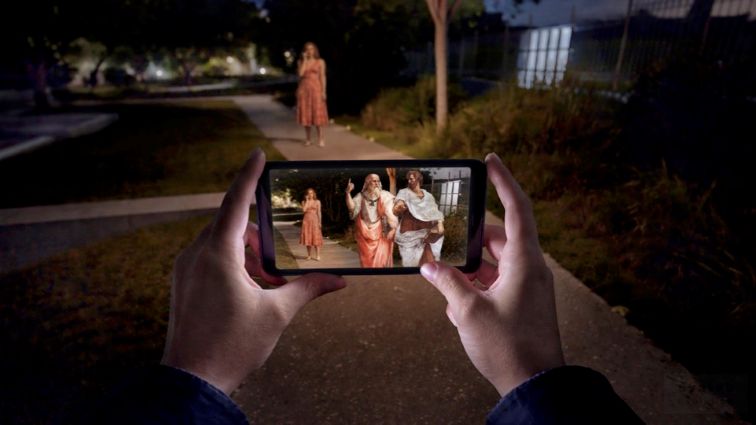 Η παρέμβαση που υλοποιείται από το Εθνικό Κέντρο Έρευνας Φυσικών Επιστημών «Δημόκριτος», αφορά στην εγκατάσταση στο νότιο τμήμα του αρχαιολογικού χώρου ενός περιπτέρου, το οποίο θα στεγάζει τέσσερις διαδραστικές οθόνες αφής, με πρόσβαση σε πολυμεσικές πληροφορίες (κείμενα, εικόνες, βίντεο, αναπαραστάσεις κ.α.). Η σύνθεση περιλαμβάνει τέσσερις ορθογώνιες μονάδες, καλυμμένες από κυματοειδές στέγαστρο. Η πρόσβαση στο περίπτερο γίνεται από τα άκρα, με ράμπες. Το έργο είναι αποτέλεσμα της συνεργασίας του ΕΚΕΦΕ «Δημόκριτος» με το αρχιτεκτονικό γραφείο Foster+Partners, το World Human Forum και του Υπουργείου Πολιτισμού. Την επιλογή του πληροφοριακού επιμελούνται διεθνούς κύρους ακαδημαϊκοί, επιστήμονες και καλλιτέχνες. Η ψηφιακή εγκατάσταση επιτρέπει την εύκολη ανανέωση και τον εμπλουτισμό του ενημερωτικού υλικού, ανάλογα με την πρόοδο της έρευνας.