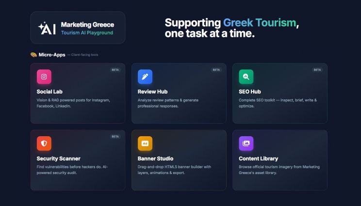 - SEO Hub: Εργαλειοθήκη τεχνικού και περιεχομενικού SEO με αξιοποίηση δεδομένων PageSpeed Insights και μετρήσεων Core Web Vitals κ.α. Περιλαμβάνει Content Writer για μετατροπή briefs σε έτοιμα προς δημοσίευση κείμενα, με επιλογές ύφους και εμπλουτισμό γνώσης (RAG).