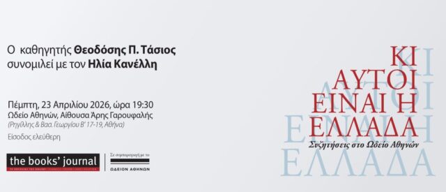 Την Πέμπτη, 23 Απριλίου, ο καθηγητής Θεοδόσης Π. Τάσιος είναι ο επόμενος προσκεκλημένος του Ηλία Κανέλλη. Η εκδήλωση είναι μέρος του πρώτου κύκλου δημόσιων συζητήσεων «Κι αυτοί είναι η Ελλάδα – Συζητήσεις στο Ωδείο Αθηνών» του Περιοδικού των Βιβλίων, The Books’ Journal σε συμπαραγωγή με το Ωδείο Αθηνών.