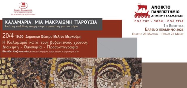 Ο Δήμος Καλαμαριάς συνεχίζει το ταξίδι γνώσης που προσφέρει το Ανοιχτό Πανεπιστήμιο, στο πλαίσιο του εαρινού εξαμήνου και της θεματικής ενότητας «Καλαμαριά: μια μακραίωνη παρουσία».